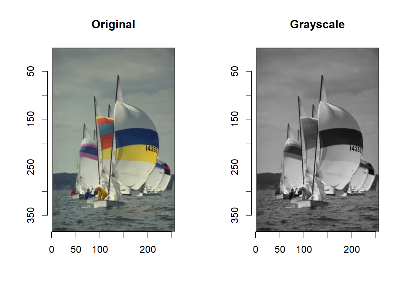 第2引数にmethodがある。 デフォルトは"Luma"となっており、この場合は輝度の線形近似によりグレースケール変換をおこなう。 他には"XYZ"をとることができるが、この場合は画像がsRGB色空間にあると想定され、CIE輝度 CIE luminanceが使われるとのこと。 特にこだわりがなければ、省略する。