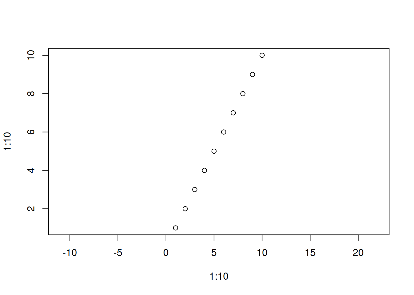 これは、1:1プロットを作るときに便利です。 1:1の線を描画したい場合などに使用します。 このとき、プロット領域の形状によっては、実際の表示が正方形にならないことがあります。 その場合は、par(pty = "s")を使用してプロット領域を正方形に設定することもできます。