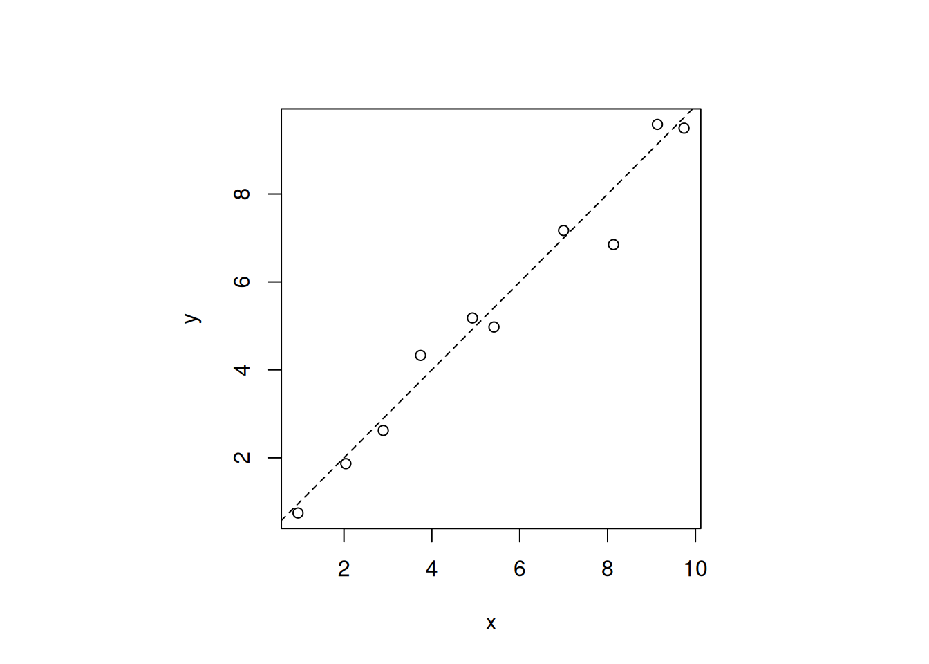 rnorm(): 正規分布に従う乱数を生成する関数です。ここでは、平均1、標準偏差0.1の乱数を生成しています。abline(0, 1, lty = 2): y = xの直線を破線で描画しています。lty = 2は破線を意味します。