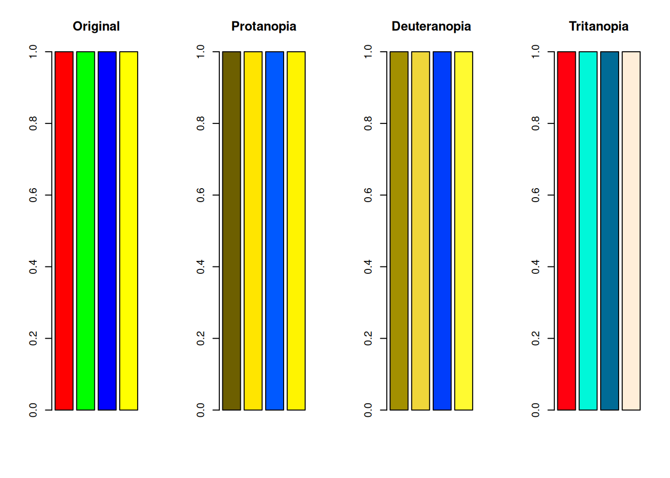 色のベクトルを用意し、deutan() (2型色覚), protan() (1型色覚), tritan() (3型色覚)を使って、色覚異常のシミュレーションを行います。