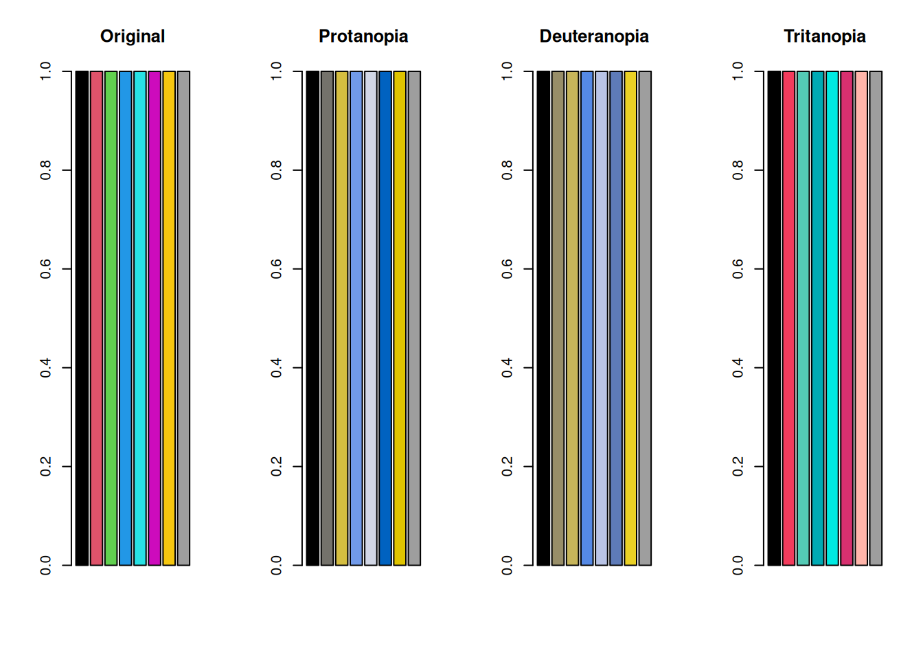 colors_protan <- protan(colors) # 1型色覚のシミュレーション